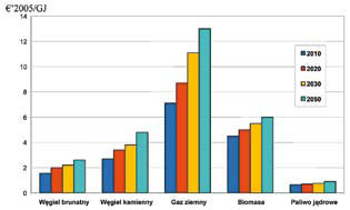 Przyjęto ceny uprawnień do emisji CO2 wzrastające z poziomu 30 Euro’05/t CO2 w 2020 r. do 60 Euro’05/t CO2 w 2050 r. Jest to konserwatywne założenie w odniesieniu do elektrowni zero-emisyjnych, przede wszystkim elektrowni jądrowych, gdyż w literaturze w większości przytaczane są wyższe ceny tych uprawnień. Dla elektrowni wiatrowych uwzględniono koszty stałe źródeł rezerwowych w systemie, które muszą funkcjonować niezależnie od mocy rezerwowej, która jest potrzebna do bezpiecznej pracy systemu. Przyjęto, że tymi źródłami rezerwowymi będą elektrownie z turbinami gazowymi. Alternatywnie rozpatrzono elektrownie wiatrowe z instalacjami akumulacji energii.