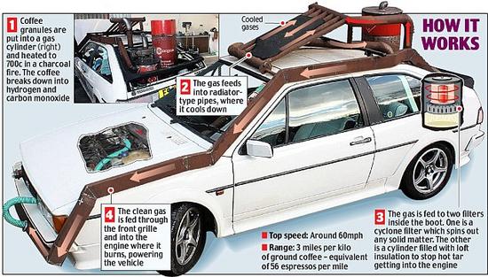 Zespół programu naukowego "Goes Bang Theory" na BBC1 opracował prototyp pojazdu bazującego na Volkswagenie Scirocco z 1998r, który działa na kawę.