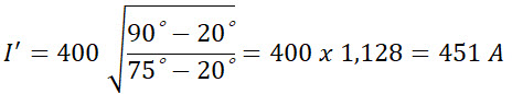 Zatem jeżeli, przykładowo kabel leży w ziemi w zwykle przyjmowanej w danych katalogowych temperaturze 20°C i temperatura żyły dla obciążenia 400A wynosi 75°C, to dla temperatury żyły 90°C (maksymalnie dla XLPE) jego dopuszczalny prąd wyniesie:
