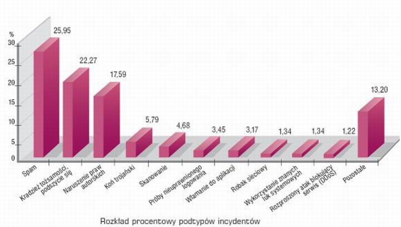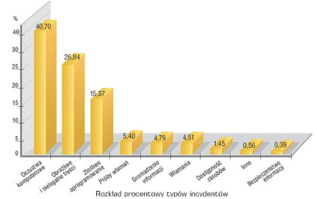 Najczęściej spotkane w Polsce formy ataków – dane statystyczne za rok 2008. Źródło: CERT
