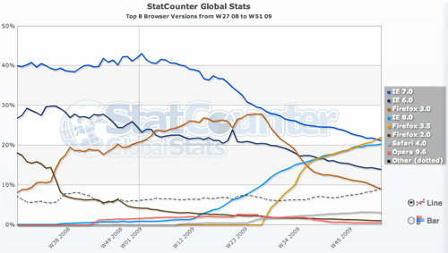 Zgodnie z najnowszymi danymi Firefox 3.5 wyprzedził IE7 w rankingu popularności. Ostatnie dane z ubiegłego tygodnia mówią, że Mozilla miała 21,93% udział w generowanym ruchu internetowym a ie7 już 21,2%. Microsoft wciąż ma przewagę w ogólnym udziale przeglądarek na rynku, ale popularność jego najnowszego IE8 rozwija się znacznie wolniej niż Firefox’a.