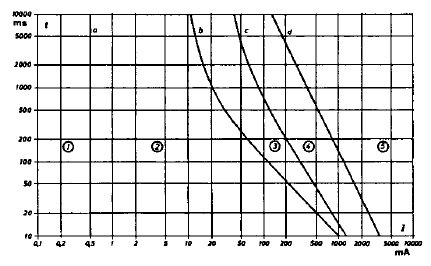 Prosta oznaczona literą a określa graniczną wartość prądu (0,5 mA) płynącego w czasie nieograniczonym i nie powodującego jego odczuwania (jak wcześniej podano – górna granica prądów nieodczuwalnych). Krzywa b określona jest równaniem
