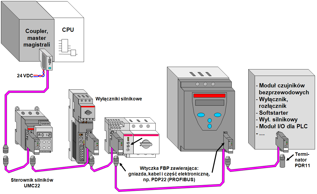 Wtyczki FBP dostępne są dla różnych sieci przemysłowych: ProfiBus DP, DeviceNet, CANOpen, ModBus-RTU. Wtyczka FBP dedykowana dla danej sieci pasuje do każdego urządzenia wymienionego w Tabeli 1, co upraszcza dobór, konfigurację i ewentualne naprawy systemu. Każda z nich posiada stopień ochrony IP65 i dostępna jest w kilku wariantach długości kabla połączeniowego. Poza tym, wtyczki FBP mają rozszerzone funkcje diagnostyczne, których nie zapewniają standardowe elementy łączeniowe. Stany urządzenia: np. wyłącznika silnikowego, wtyczki czy magistrali są wyświetlane za pomocą diod LED. Dzięki temu użytkownik otrzymuje jednoznaczną informację pomagającą uniknąć usterek lub szybko je znaleźć i usunąć w przypadku błędów. Czasy i ilości dodatkowych przestojów systemów są znacznie zredukowane, dzięki możliwości parametryzacji on-line, również podczas pracy urządzeń.