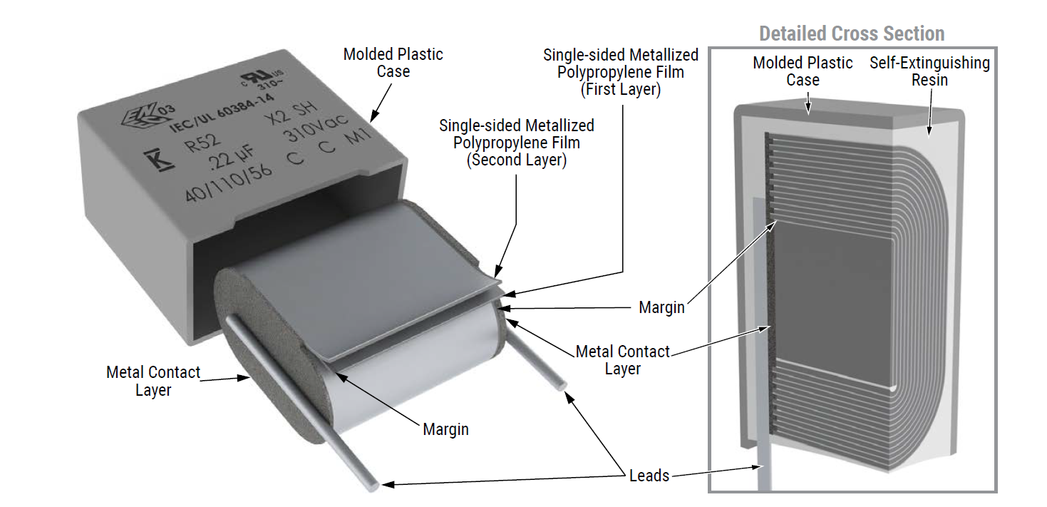 Kondensatory firmy Kemet zbudowane są z dwóch warstw – przewodzącej i izolującej, które tworzą razem spłaszczony walec. Po jego obu stronach znajdują się metalowe płytki, do których przytwierdzone są wyprowadzenia. Całość umieszczona została w plastikowej obudowie.