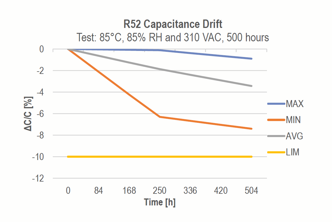 Kondensatory R52, podobnie, jak inne produkty marki Kemet poddawane są licznym testom, które potwierdzają ich niezawodność w każdych warunkach. Na ich podstawie można zauważyć, że nową serię kondensatorów charakteryzuje m.in. doskonała odporność na niesprzyjające warunki zewnętrze. Testy spadku pojemności prezentuje wykres: