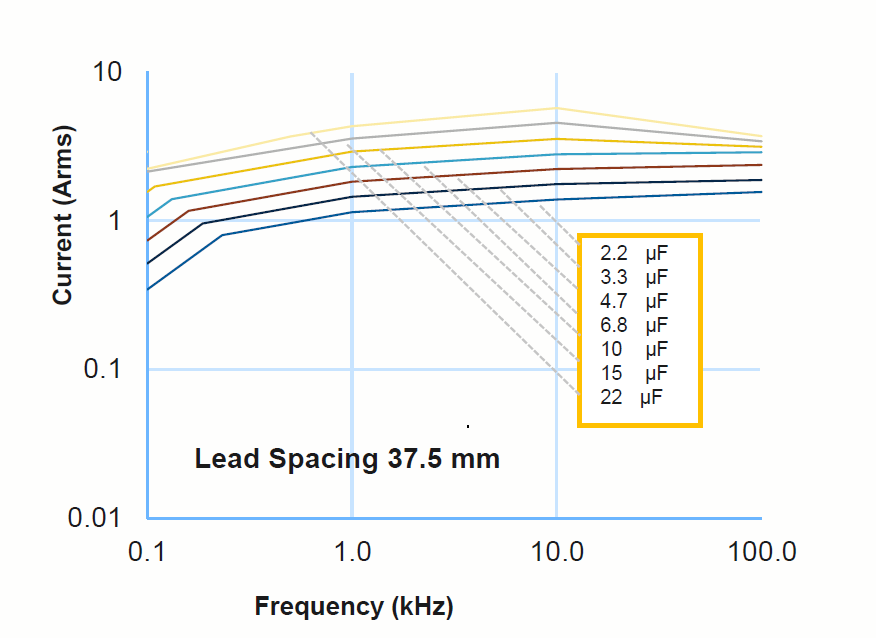Na uwagę zasługuje również maksymalny prąd ładowania nowych kondensatorów. Podczas testu sprawdzana była wartość prądu ładowania zależnie od częstotliwości i pojemności kondensatora. Test wykonano w temperaturze 25°C. Przy niektórych pojemnościach prąd ładowania poniżej częstotliwości 1kHz jest mniejszy od 1A, jednak po przekroczeniu 1KHz prąd zawsze jest większy od 1A. Wyniki prezentuje wykres: