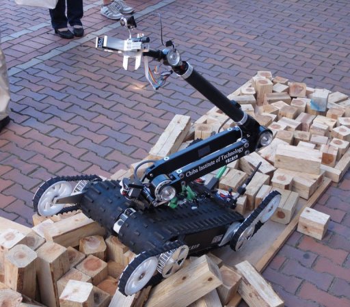 Urządzenie wielkości samochodu-zabawki posiada ramię, które może być zdalnie sterowane i służyć np. do otwierania drzwi lub jako pomoc przy poruszaniu się po gruzie.