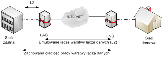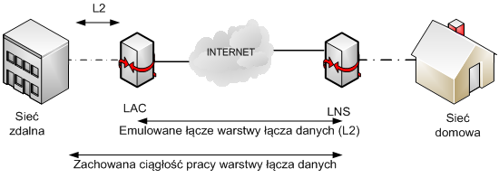 - LAC-LNS – z jednej strony LAC odbiera ruch z łącza, na którym działa protokół warstwy łącza danych, np. PPP. Ruch przesyłany jest dalej z wykorzystaniem protokołu L2TP poprzez sieć szkieletową, np. sieć IP. Z drugiej strony LNS logicznie zakańcza połączenie L2TP i przekazuje dalej dane do innych urządzeń, z wyjątkiem sytuacji, gdy komputer PC pełniący rolę LNS sam jest adresatem wiadomości. Ustanowienie sesji jest inicjowane przez LAC (Incoming Call) lub przez LNS (Outgoing Call). Przykład takiej architektury przedstawiono na rysunku 1.