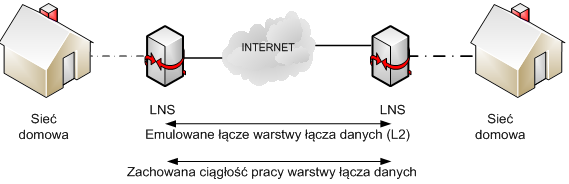 Rysunek 2. Przykład architektury LAC-LAC. - • LNS-LNS – w modelu tym oba urządzenia LCCE pracują jako LNS. Typowo połączenie inicjowane jest z poziomu użytkownika, np. tunel zainicjowany z komputera PC przez użytkownika. Przykład tej architektury ilustruje rysunek 3.