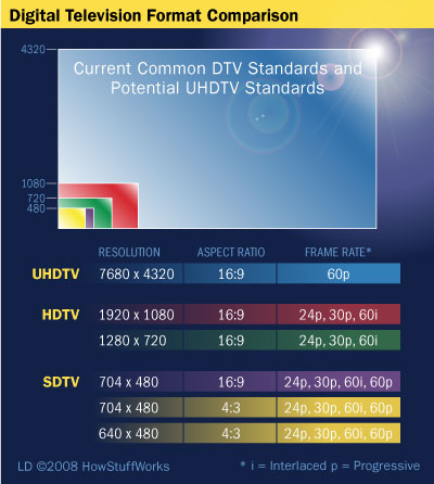 UHD ma pojawić się w 2 poziomach rozdzielczości 7680 x 4320 pikseli (8K) i 3840 x 2160 pikseli (4K) co odpowiada od 4 do 16 razy więcej pikseli na ekranie niż jest to obecnie przy rozdzielczości Blu-ray w trybie 1080p.