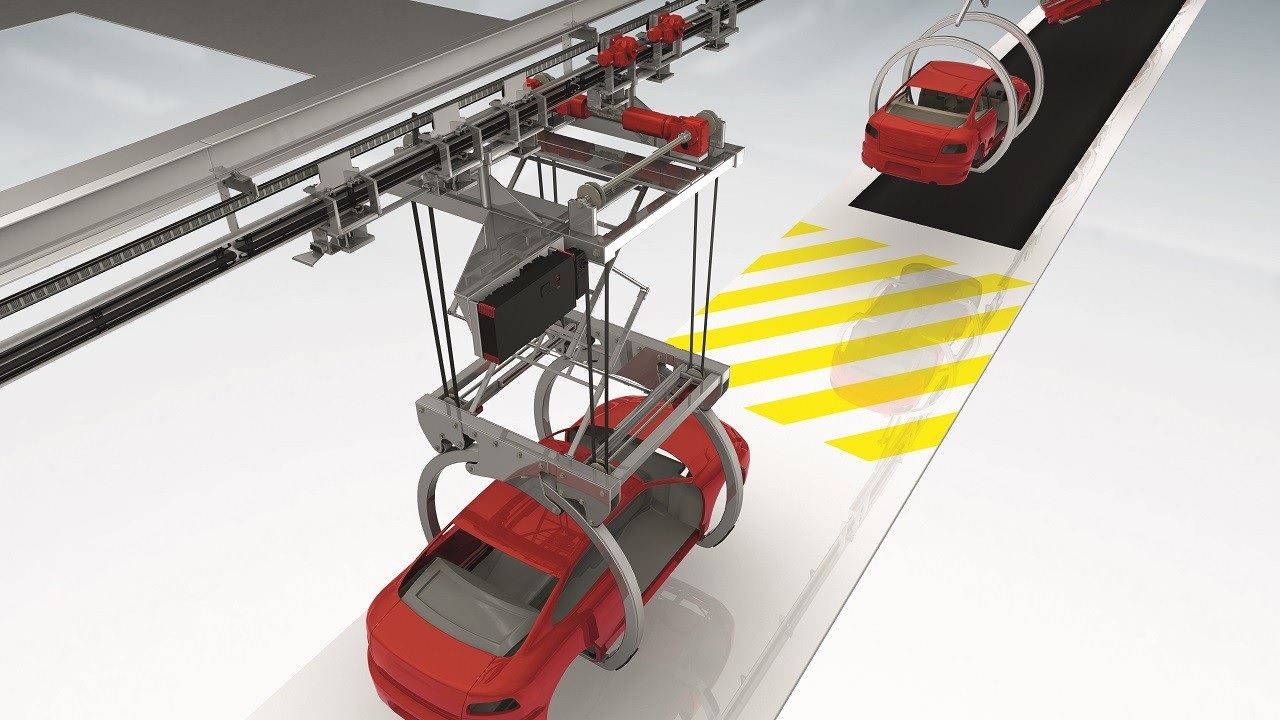 System transportowy złożony jest z potężnego wózka transportowego oraz automatycznej stacji rozładowczej. Trasa przejazdu wózka o długości 160 metrów (z produkcji do obszaru pakowania) realizowana jest za pomocą samojezdnego wózka transportowego AGV o wymiarach 5,9 x 2,2 metra, zasilanego bezkontaktowo na całej trasie przejazdu za pomocą umieszczonej w posadzce pętli indukcyjnej.