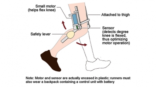 Motorowe kolano to zestaw ważący 5kg, Składa się z taśm i urządzenia instalowanego przy nogach a także jednostki sterującej i akumulatora w postaci plecaka. Urządzenie nie jest dedykowane do osób niepełnosprawnych, ale ma na celu wspieranie elastyczności kolan dla ludzi, którzy chcą się przemieszczać bardziej efektywnie.