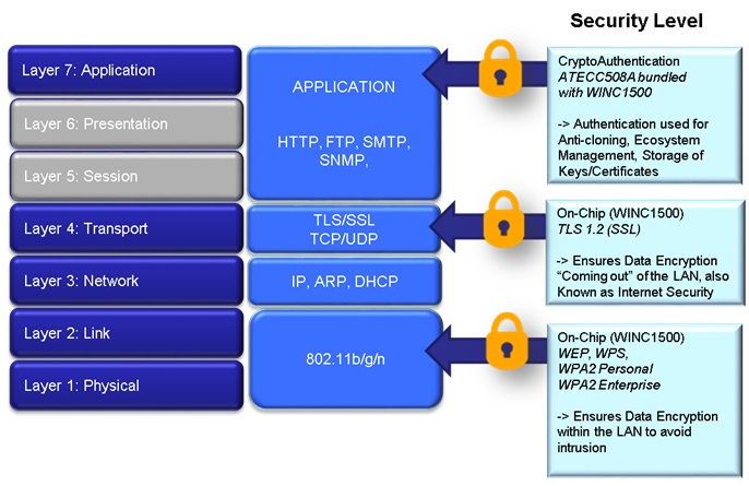 Jeżeli chodzi o zapewnienie bezpieczeństwa przesyłanych informacji w niższych warstwach modelu OSI (warstwa połączenia oraz warstwa fizyczna), układy z serii ATWINC15x0 obsługują standardy WEP/WPA/WPA oraz WPS.