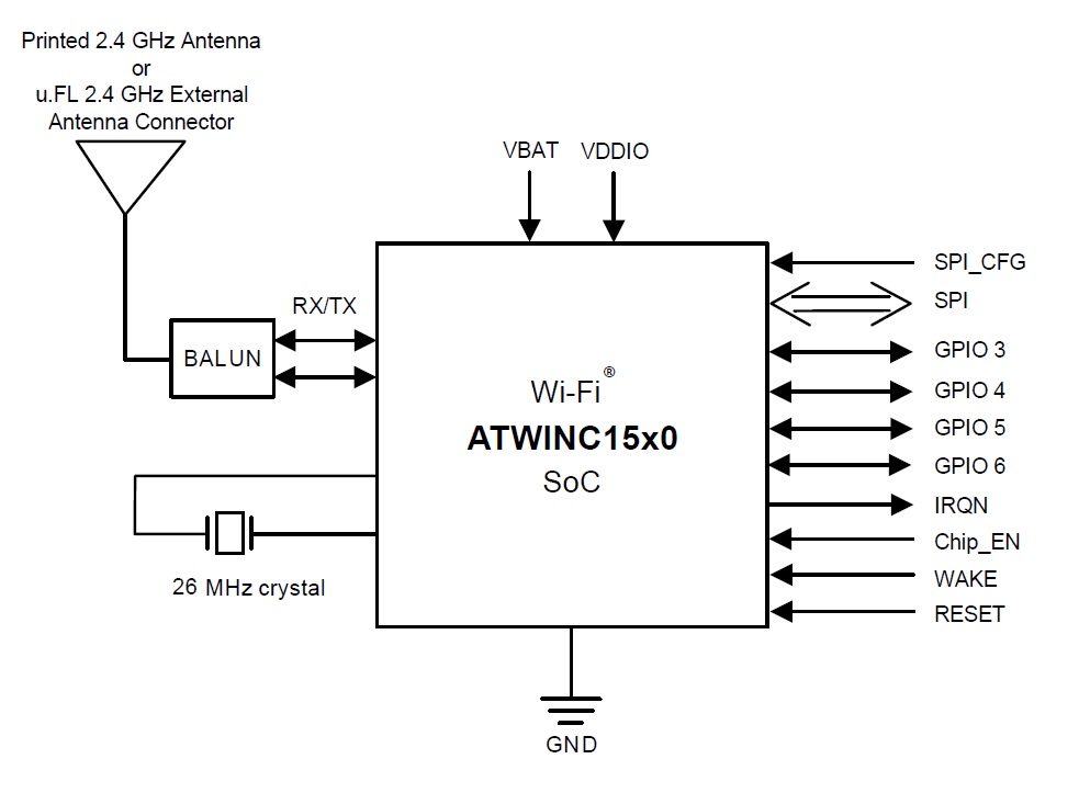 Moduł w zależności od wersji posiada także zintegrowaną antenę w postaci ścieżki na PCB lub konektor u.FL do przyłączenia anteny zewnętrznej. Jest on przeznaczony do montażu SMD, a jego wymiary to 21,7×14,7×2,1 mm. Schemat blokowy modułu ATWINC15x0 oraz jego zdjęcie zostały przedstawione na rys. 2 i 3.
