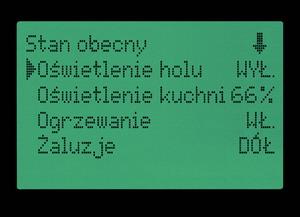Sądziłem, że instalacja w salonie będzie nie do rozgryzienia. Dwa żyrandole, dwie grupy kinkietów, lampa stojąca, oświetlenie akwarium, lampka za telewizorem i halogeny oświetlające obrazy. 8 rodzajów oświetlenia. Oczywiście, poza lampą nad akwarium i przy telewizorze, każda lampa powinna być ściemniana. Do salonu można wejść z holu, kuchni, gabinetu i tarasu. W salonie chciałem mieć żaluzje: na dwóch oknach od strony południowej oraz na oknie zachodnim i drzwiach na taras. Do obsługiwania tego sprzętu miały wystarczyć po dwa poczwórne przyciski umieszczone przy każdym wejściu, oraz dodatkowo dla wygody pilot. Dolny przycisk służy do sterowania żaluzjami (od strony południowej obie na raz i osobno żaluzje w drzwiach i zachodnim oknie, plus dolny klawisz do sterowania wszystkimi jednocześnie). Natomiast górny – dla mnie to rewolucja – miał tworzyć sceny. Zacząć trzeba od wyobrażenia sobie różnych typowych sytuacji. Dwie podstawowe to wszystko włączone i wszystko wyłączone. Co jeszcze? Wystawne przyjęcie, spotkanie z przyjaciółmi, intymna kolacja we dwoje, odpoczynek przy gazecie, oglądanie filmu w telewizji, obserwowanie rybek. Każda z tych sytuacji wymaga innej oprawy. Najlepiej zrobić tabelkę. W 8 rzędach wpisać nazwy scen, a w 8 kolumnach wpisać stany poszczególnych lamp. Np. scena 3: 100% – oświetlenie obrazów; 90% jasności – żyrandol 1, akwarium; 30% – kinkiet 1 i lampa stojąca przy kanapie; 20% – żyrandol 2; 0% (wyłączone) – lampa przy TV i kinkiet 2. Można wyregulować oświetlenie stosownie do każdej sytuacji, zapamiętać je, przyporządkować każdemu klawiszowi jakąś sytuację, a następnie jednym naciśnięciem przywołać odpowiednie sceny. Pilotem rzecz jasna też to można zrobić, ale ja wolę sobie nim, niezależnie od scen, regulować stan każdej lampy. Nie ma problemu. Oczywiście regulacja temperatury i czujniki otwarcia okiem znajdują się także w salonie.