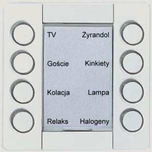 Dość duży, 3x6m. Stąd można wejść do kuchni, salonu, gabinetu, WC, garderoby i dalej schodami na piętro. Tutaj stale ktoś się kręci. Potrzebne są wyłączniki przy każdych drzwiach i najlepiej, aby każdym z nich można było zapalać i ściemniać żyrandol, kinkiety, oraz zapalać oświetlenie kolekcji broni (umieszczonej na ścianach). Myślałem o zamontowaniu przy każdym wejściu dwóch ściemniaczy i wyłącznika. Okazało się, że wystarczy wszędzie zainstalować po jednym czteroklawiszowym przycisku. Pierwszy i drugi klawisz do włączania i regulacji żyrandola i kinkietów, trzeci do oświetlenia ścian, a czwarty do włączania i wyłączania wszystkich trzech oświetleń równocześnie. Co więcej – jeśli później będę chciał dołączyć nowy obwód, wystarczy przeprogramować przycisk.
