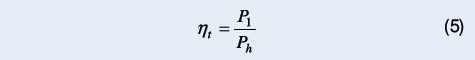Moc hydrauliczną Ph strumienia cieczy obliczono według wzoru (4). Sprawność turbiny ηt (iloraz mocy wydawanej na wale turbiny P1 do mocy hydraulicznej strumienia Ph) wynosi: