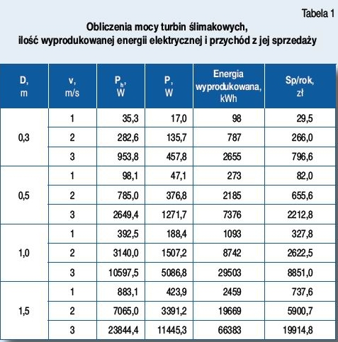 W tabeli 1 przedstawiono obliczenia dla następujących założeń: sprawność turbiny ηt = 0,6, sprawność prądnicy ηe = 0,8, sprawność hydrozespołu ηh = ηe • ηt = 0,48, Suma uzyskanych przychodów za wyprodukowaną energię elektryczną rocznie (turbina pracuje przez 8 miesięcy – 5800 h) Sp/rok. Obliczenia wykonano dla czterech średnic turbin 0,3; 0,5;