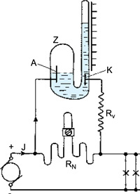 Na rysunku 7 przedstawiono konstrukcję i schemat połączeń elektrolitycznego licznika rtęciowego. Najważniejszą jego częścią była dolna kapilara pomiarowa M, za którą przymocowana była skala. W części górnej rurka ta miała o wiele większą średnicę, tworząc tzw. komorę elektrodową, przedzieloną ścianą W z porowatego szkła.