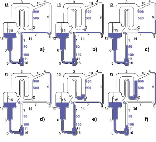 Powyższe przebiegi powtarzają się aż do osiągnięcia stanu 999. Z chwilą opuszczenia się cieczy w rurce 1 do poziomu 100 słupek elektrolitu 9 zostaje znowu przepchnięty do rurki 2 (stan 1000); rurka 2 jest wskutek tego odgrodzona od przejścia 3. W tym momencie całe ciśnienie rurki 1 działa na zawartość rurki 2 i powoduje przepłynięcie jej przez rurkę 13 do zapasowej komory 14. W ten sposób cały licznik wraca do położenia początkowego.