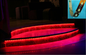 Efekt pokazany na zdjęciu obok został uzyskany poprzez zastosowanie taśmy RGB (wielokolorowej) bez profilu ochronnego. W tym przypadku niemożliwe było zastosowanie profilu LED aluminiowego ze względu na łuki jakie tworzą stopnie. Dodatkowo zastosowano taśmę RGB w silikonie, który chronił ją przed otarciami, kurzem i wilgocią. Taśma RGB w silikonie jest dobrym rozwiązaniem na schodach o nietypowym kształcie i tam gdzie nie ma możliwości zastosowania innych zabezpieczeń.
