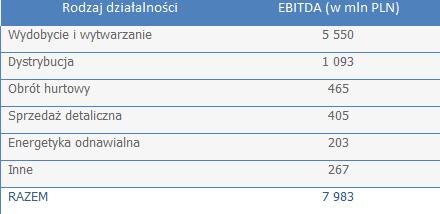 Najbardziej dochodową działalnością PGE pozostaje energetyka konwencjonalna. Udział tego segmentu działalności w skonsolidowanej EBITDA wyniósł ponad 69%. Najwyższy wzrost EBITDA zanotował segment sprzedaży detalicznej. Kluczowymi czynnikami w tym przypadku były wyższa sprzedaż dla klientów biznesowych oraz wzrost średnich cen energii.
