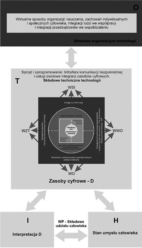 O – Składowa organizacyjna przedstawia obrazy wirtualnej (cyfrowej) organizacji działań w obszarach: nauczania, życia – zachowań indywidualnych i społecznych ludzi, pracy – wirtualnych sposobów integracji ludzi we współpracy i wirtualnych sposobów integracji przedsiębiorstw w organizacji ich współdziałania. Rezultatem jest kształtowanie struktur cyfrowej (wirtualnej) organizacji: (1) nauczania, (2) życia – zachowań człowieka (ludzi) w środowisku publicznych systemów informacyjnych, (3) pracy, (4) współdziałania przedsiębiorstw.