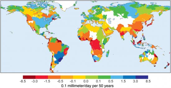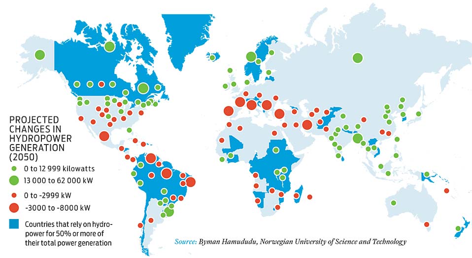 Zgodnie z oczekiwaniami, najbardziej zagrożone są te obszary, które są silnie zależne od energii wodnej i będą musiały stawić czoła zmniejszenie dopływu rzek. Przykładowo w Afryce Południowej, bardziej suche warunki w 2050 roku mogą oznaczać spadek mocy elektrowni wodnych o 70 gigawatogodzin rocznie. Afganistan, Tadżykistan, Wenezuela i pewne części Brazylii również mogą być mocno dotknięte.