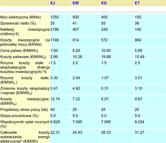 Studium fińskie, oparte na szczegółowych analizach ekonomicznych uwzględniających aktualne osiągi elektrowni jądrowych na świecie i w Finlandii [2] przedstawia porównanie czterech możliwych źródeł energii, mianowicie energii jądrowej (EJ), elektrowni węglowej kondensacyjnej (EW), elektrowni gazowej z cyklem połączonym (EG) i elektrowni opalanej torfem (ET). Zasadnicze parametry i dane kosztowe dla tych elektrowni przedstawione są w tablicy 2.1. Wszystkie koszty wyrażone są w Euro (€) przy przeliczniku 1 € = 0,9 USD. Jako elektrownię odniesienia w cyklu węglowym przyjęto istniejącą w Finlandii elektrownię Meri- Pori o mocy 560 MWe opalaną pyłem węglowym, a w przypadku torfu rozpatrywano spalanie w złożu fluidalnym. Dane dla elektrowni gazowej przyjęto zgodnie z najnowszymi osiągnięciami technicznymi w praktyce międzynarodowej. Moc EW i EG wybrano dostatecznie duże by zrealizować korzyści skali. Elektrownia węglowa byłaby zlokalizowana na wybrzeżu morskim. Wielkość elektrowni torfowej ograniczono do 150 MWe, ponieważ przy większej mocy transport paliwa stałby się zbyt dużym obciążeniem.