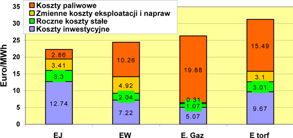 Elektrownia jądrowa wymaga znacznie wyższych nakładów inwestycyjnych niż pozostałe źródła energii – 1749 €/kW łącznie z kosztem pierwszego wsadu paliwowego do rdzenia, co stanowi jednostkowe nakłady inwestycyjne trzykrotnie wyższe niż dla elektrowni gazowej. Ale koszty paliwowe są znacznie niższe i przy współczynniku obciążenia powyżej 70% energia jądrowa staje się najtańszym źródłem energii [2]. Przy współczynniku obciążenia 80% koszty paliwowe wynoszą dla cyklu jądrowego 2,36 c€/kWh, dla węgla 2,54, dla gazu 2,69 i dla torfu 3,26 c€/kWh. Przy współczynniku wykorzystania mocy zainstalowanej równym 90% (co w Finlandii stanowi wartość odniesienia dla EJ) przewaga energii jądrowej wzrasta, bo koszty paliwa jądrowego wynoszą tylko 2,15 c€/kWh, podczas gdy dla węgla są one równe 2,41 i dla gazu 2,61 c/kWh. Gaz jest najtańszy tylko przy współczynnikach obciążenia poniżej 55%. [1]