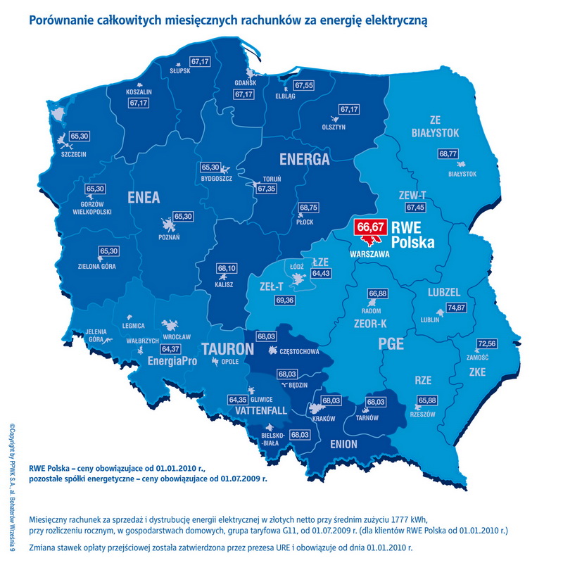 Od 1 stycznia 2010 roku łączny rachunek warszawiaka (w rozliczeniu półrocznym i przy średnim ogólnopolskim rocznym zużyciu energii na poziomie 1777 kWh) wzrośnie miesięcznie o 1,86 zł netto, co stanowi przyrost o 2,82% w odniesieniu do łącznego rachunku.