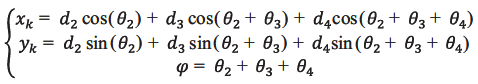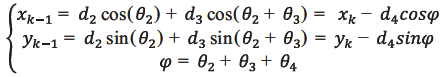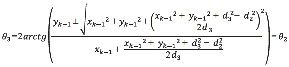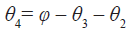Poszukiwanymi zmiennymi są więc kąty obrotu poszczególnych przegubów θi, gdzie i ∈ {1, 2, 3, 4} (rys. 3). Punkt początkowy oznaczono symbolem P0= [0, 0, 0], a punkt końcowy (położenie efektora) – P= [xk, yk, zk]. Danymi wejściowymi dla obliczeń są xk, yk, zk, długości poszczególnych przegubów di, gdzie i ∈ {1, 2, 3, 4} oraz kąt φ, będący kątem pomiędzy osią OX przyjętego układu współrzędnych, a prostą łączącą punkt Pk z początkiem układu. Kąt θ dany jest wzorem:
