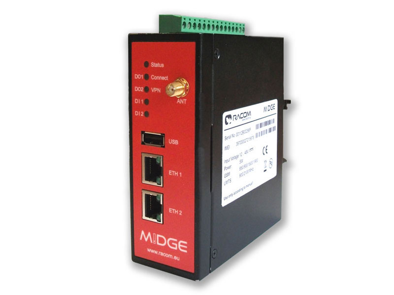 M!DGE jest profesjonalnym, przemysłowym routerem bezprzewodowym przeznaczonym do transmisji danych w aplikacjach SCADA i telemetrycznych. Doskonale realizuje zadania wszędzie tam, gdzie konieczna jest pewna i stabilna bezprzewodowa komunikacja, także na dużych instalacjach, w których pracują setki urządzeń. Wbudowany podwójny port Ethernetowy (10/100), port szeregowy RS-232 i USB umożliwiają routerowi współpracę z wieloma różnymi urządzeniami. Przykładowo, przez port RS-232 można podłączyć do platformy SCADA sterowniki PLC, falowniki etc., i uzyskać do nich zdalny, bezprzewodowy dostęp. M!DGE ma także zintegrowane 2 wyjścia i 2 wejścia cyfrowe, którymi można zarządzać przez program lub stronę www.