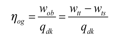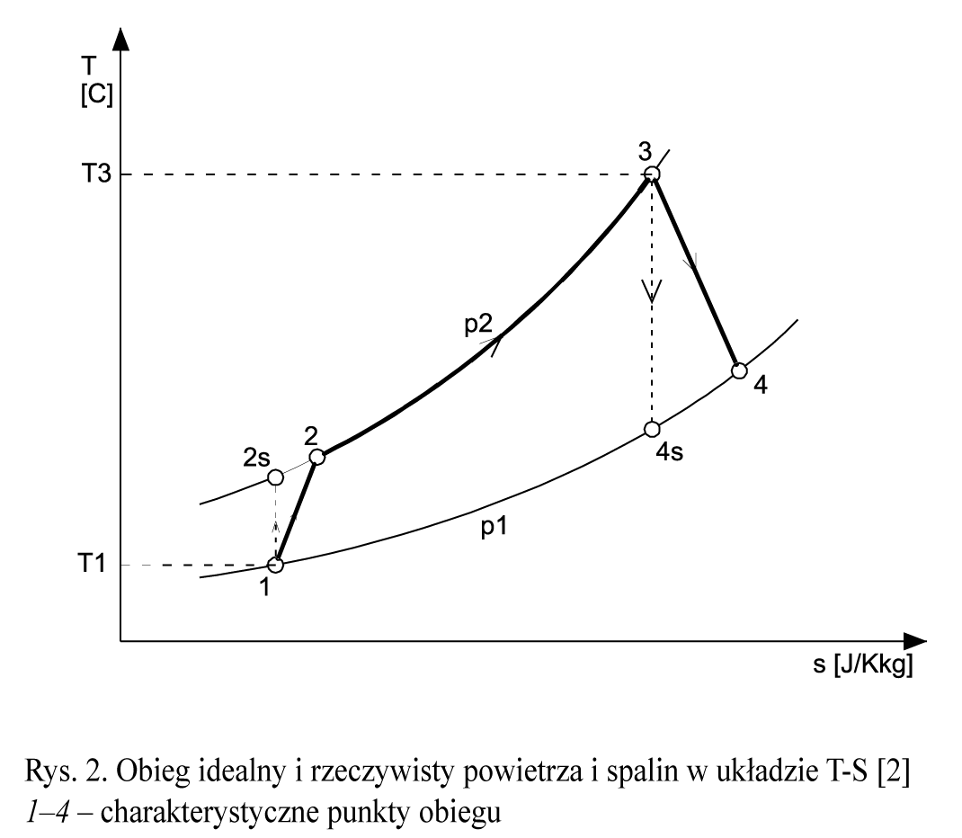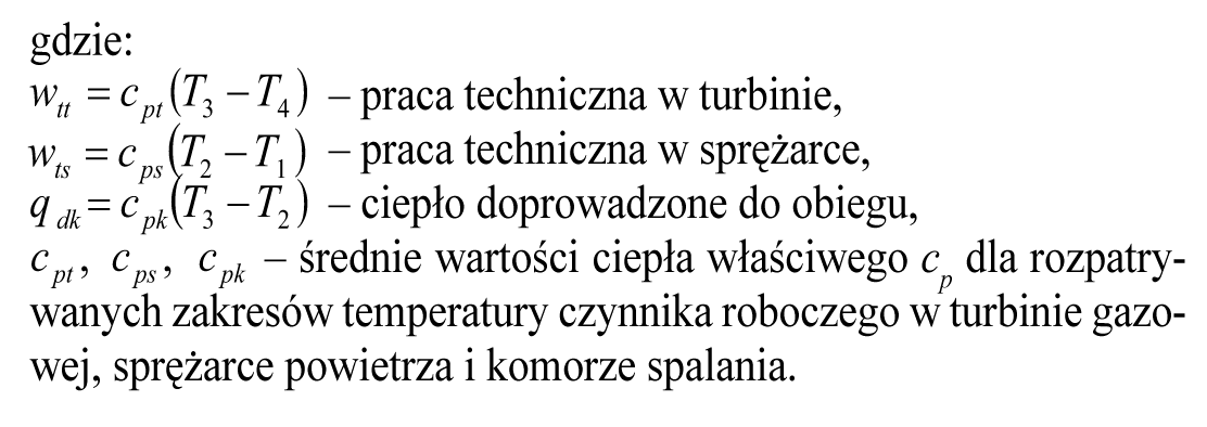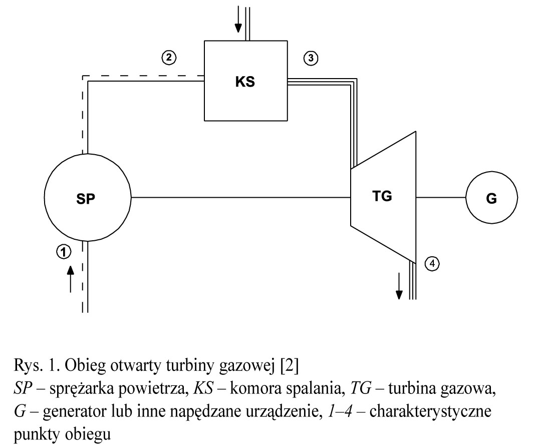 W przypadku tłoczni gazu ziemnego turbina pracuje w tzw. obiegu otwartym, co oznacza, że spaliny (będące czynnikiem roboczym) po przejściu przez łopatki turbiny trafiają do atmosfery. Sprawność energetyczna takiego obiegu (obieg Braytona) jest wyznaczana jako stosunek ciepła przetwarzanego na pracę obiegu wob do ciepła doprowadzonego do obiegu w komorze spalania MDK