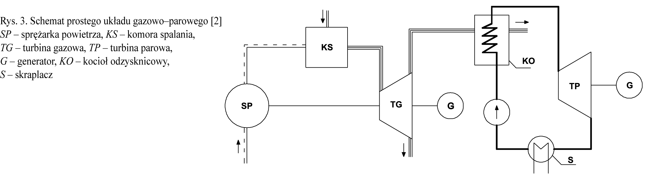 W układach prostych (jak na rys. 3), spaliny z turbiny gazowej trafiają do kotła odzysknicowego, po czym są usuwane do atmosfery. W kotle powstaje para wodna, która przepływa do turbiny parowej napędzającej generator prądu elektrycznego, następnie – po skropleniu – wraca do obiegu. Zastosowanie kotłów odzysknicowych pozwala na znaczne zwiększenie sprawności. W porównaniu do turbiny pracującej w układzie otwartym, układy kombinowane osiągają sprawność rzędu 54–60%.