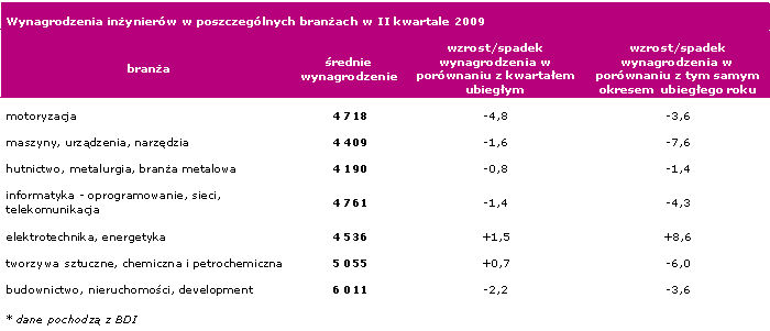 10% inżynierów zarobiło poniżej 2 200 PLN. Obniża się próg jaki należy przekroczyć, aby znaleźć się w grupie 25% inżynierów zarabiających najwięcej. W II kwartale 2009 wystarczyło otrzymać wynagrodzenie na poziomie min. 5 700 PLN, aby znaleźć się w tej grupie. To o 1,7% mniej niż w I kwartale 2009. W podobnym okresie ubiegłego roku próg ten wynosił 5 906 PLN. Co dziesiąty inżynier zarobił ponad 8 340 PLN, odnotowując tym samym zarobki większe średnio o 4,3% niż te, które otrzymał w I kwartale 2009.