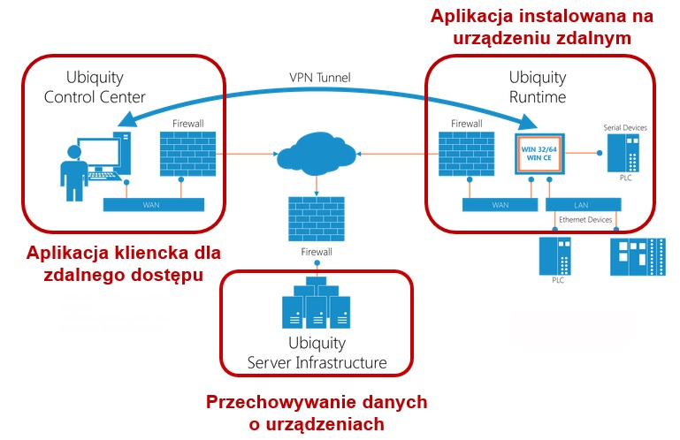 Ubiquity używa połączenia internetowego, tworząc sieć VPN pomiędzy komputerem serwisowym (który pełni funkcję stacji nadzorczej Ubiquity Control Center) a zdalnym urządzeniem (z aplikacją Ubiquity Runtime). Stacja nadzorcza uzyskuje dostęp do takich funkcji jak: zdalny pulpit, czat, wymiana plików, zdalne programowanie i serwisowanie urządzeń oraz aktualizacja aplikacji.