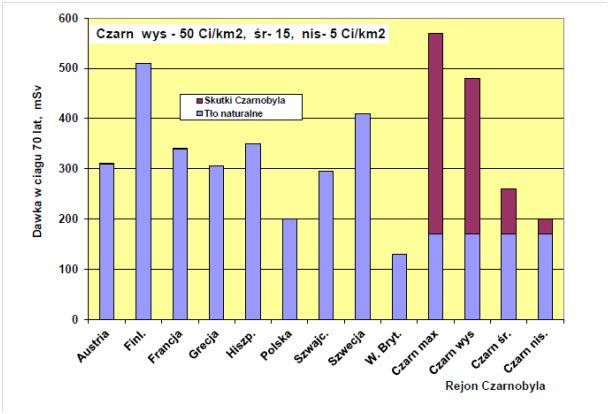 Dawki, jakie otrzymają w ciągu 70 lat życia mieszkańcy różnych krajów powodowane przez promieniowanie naturalne, pokazano na rysunku powyżej obok dawek w rejonie Czarnobyla, powodowanych przez promieniowanie naturalne i dodatkowe promieniowanie spowodowane przez awarię w Czarnobylu. Widać z niego, że trwała ewakuacja była niepotrzebna. Ludzie, którzy pozostali wbrew nakazowi ewakuacji na terenach wysoko skażonych wokoło Czarnobyla otrzymają od promieniowania wywołanego awarią dodatkowo 310 mSv w ciągu 70 lat życia. Jest to dawka mniejsza od różnicy dawek otrzymywanych w ciągu życia przez mieszkańca Finlandii (510 mSv) i Polski (poniżej 200 mSv). Dawki na terenach nisko, średnio i wysoko skażonych są MNIEJSZE niż średnie dawki w Finlandii, na dużej części terytorium Szwecji, Francji i innych krajów. A przecież nikt nie proponuje ewakuować Helsinek czy mieszkańców Masywu Centralnego we Francji.