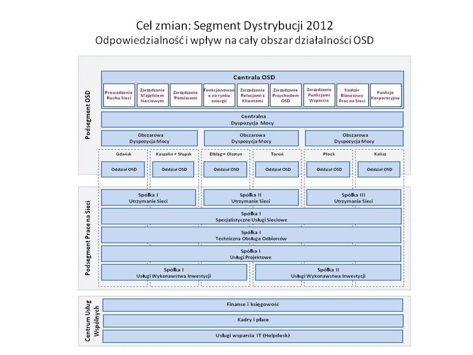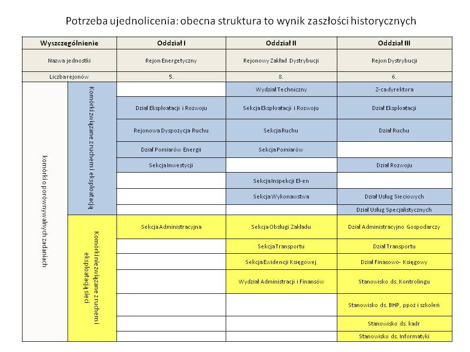 O tym, ze struktura wymaga zmian przekonuje wykres, ukazujący dotychczasowe zadania realizowane w rejonach – 41 jednostkach terytorialnych zajmujących się kierowaniem dystrybucją energii elektrycznej, zgrupowanych w 8 oddziałach spółki. Oddziały te były  przed konsolidacją w 2005 roku odrębnymi spółkami energetycznymi.